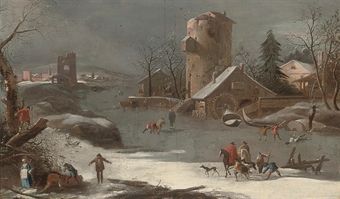 | A winter landscape with skaters on a frozen river and a town beyond | |