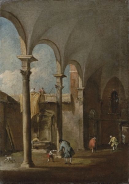 | A capriccio of an arcade in a courtyard, with a man talking to a boy and other figures | |