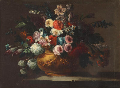 A bronze vase filled with chrysanthemums, roses, convolvulus and other flowers; and Roses, chrysanthemums, poppies and other flowers in a bronze urn on a stone ledge | |