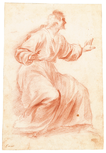 | RECTO: A SEATED MALE FIGURE, HIS FACE IN PROFILE, WITH ARMS OUTSTRETCHED VERSO: FAINT RED CHALK STUDIES OF A FIGURE OF HERCULES | |
