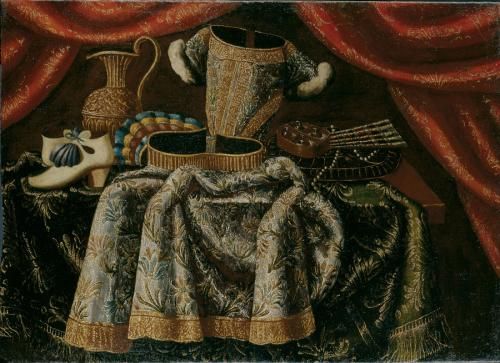 | NATURA MORTA CON VESTITO, SCARPE, PROFUMI, VENTAGLIO E UNA BROCCA SU UN TAVOLO CON TAPPETO, SOTTO UN TENDAGGIO ROSSO | |