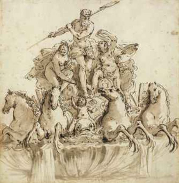 | Design for a fountain of Neptune in his chariot drawn by four hippocamps, flanked by nymphs and putti | |