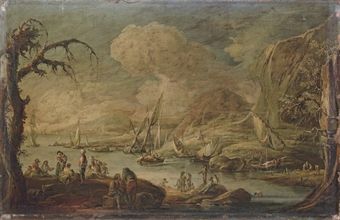A coastal inlet with soldiers and peasants resting, with shipping beyond