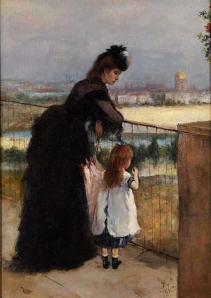 JUNGE FRAU MIT TOCHTER AUF EINEM BALKON