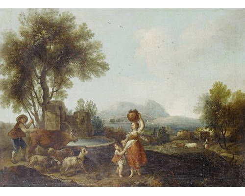 | A pastoral landscape with a washerwoman and her child beside a well, a cowherd with his livestock and a country village and moun | |