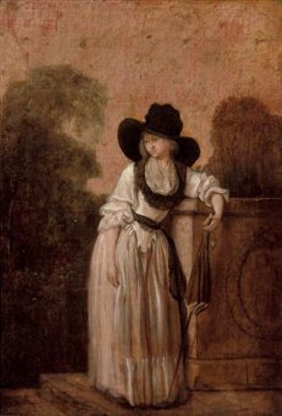 | Portrait of a lady, full-length, in a white dress and black hat, with a parasol, leaning on a plinth, in a landscape | |