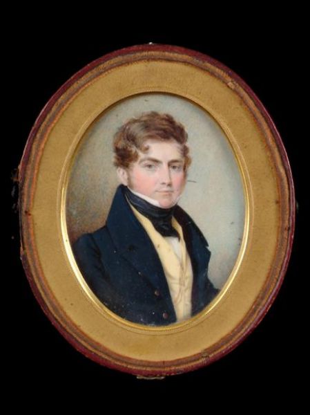 | Portrait of Nathaniel Miers of South Wales, father of Mollie Anne, wearing a blue coat, a yellow waistcoat and a black stock | |