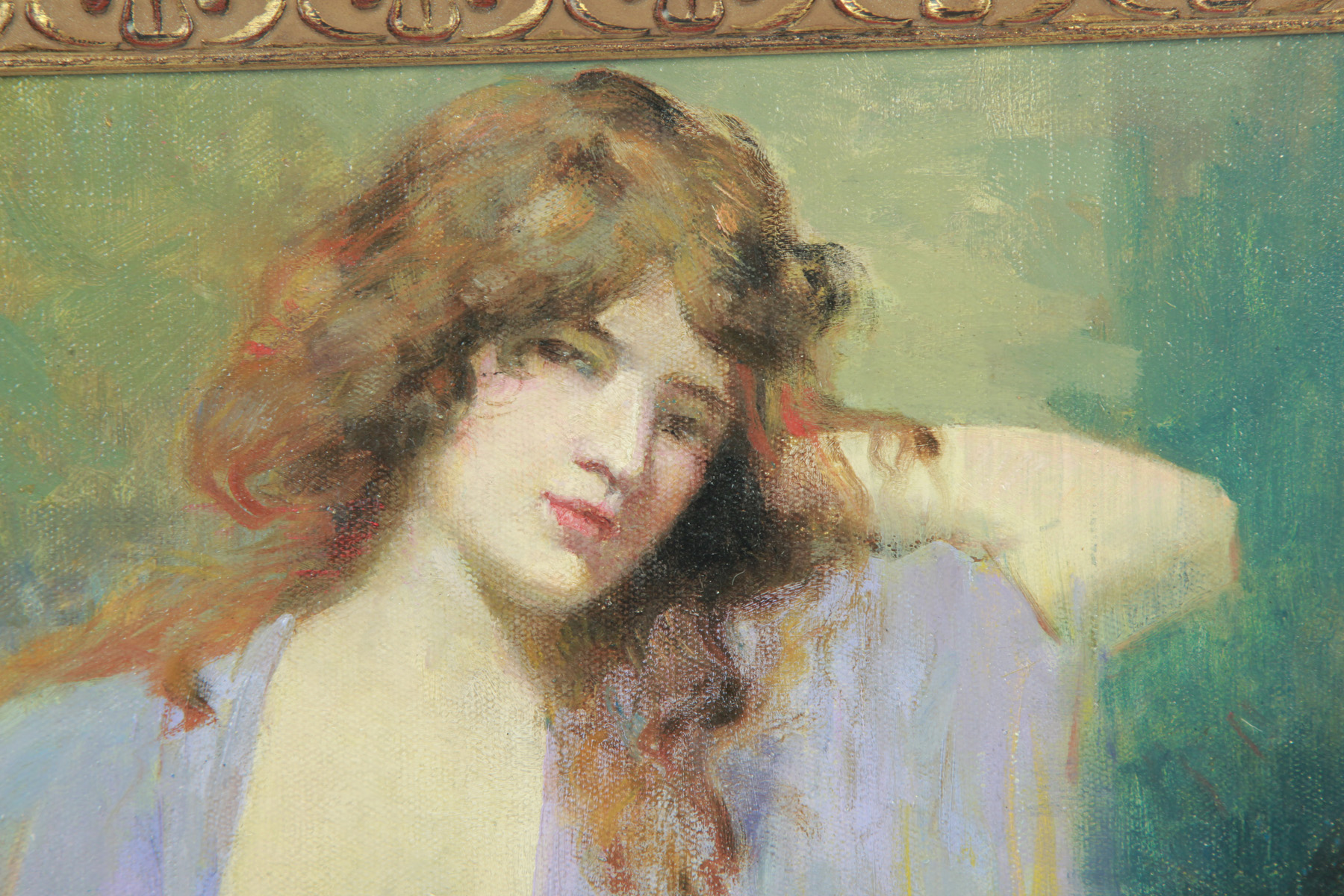 A partially nude female figure seen wearing a purple shawl. 9"h. 11"w., in a modern frame | |