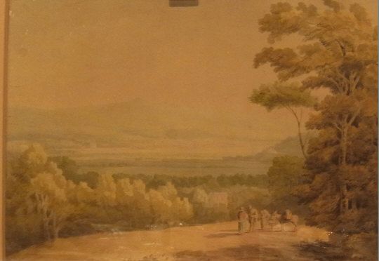 | Italianate landscape scene of family in raised foreground, with donkey and dog, having view of town beyond lake in distance | |
