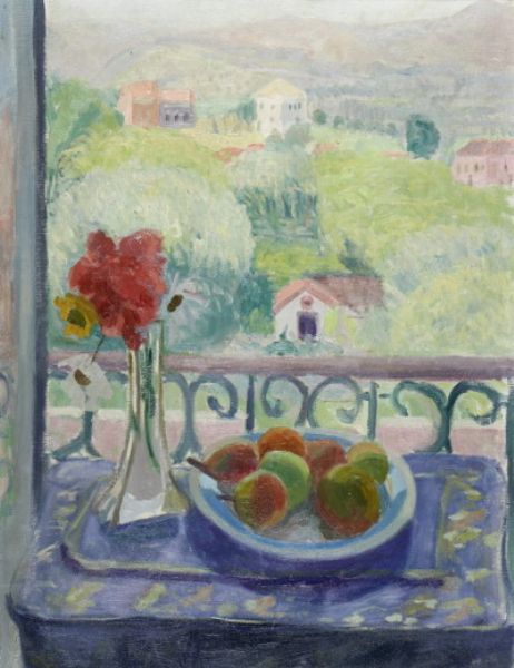 Paisagem vista de uma janela, com mesa, frutos e flores