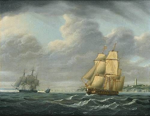 A frigate running down the coast with other shipping beyond
