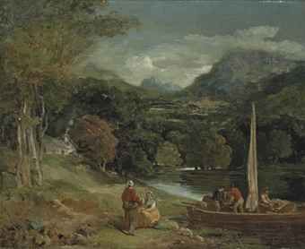 | A wooded river landscape with figures unloading barrels from a small ferry boat, a cottage and mountains beyond | |