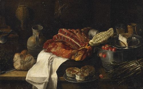 | STILL LIFE WITH MEAT, BREAD, CHERRIES AND OTHER OBJECTS IN A KITCHEN INTERIOR | |