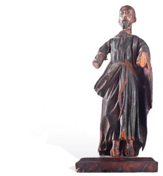 Wood Carved, polychrome decoration, glass eyes, square base.