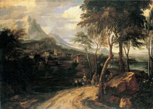 GEBIRGSLANDSCHAFT MIT REITERN UND WANDERERN