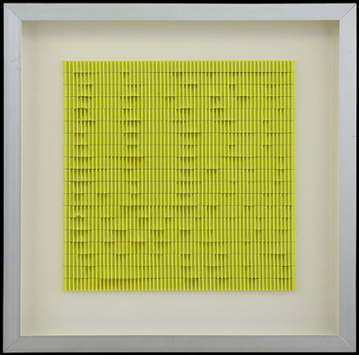 assemblaggio di materie plastiche su pannello in plastica 50x50 cm, firma, titolo e anno incisi al retro, dichiarazione d'autenticità dell'artista su foto. | |