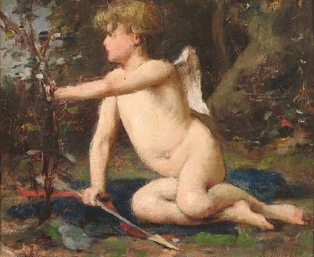 Sitzender Amor mit Pfeil vor blühendem Busch.