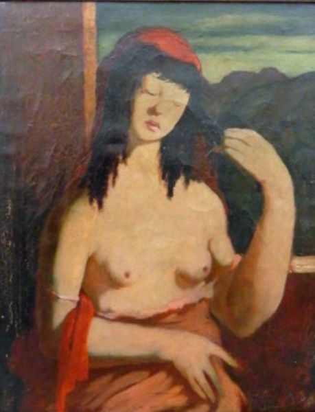 Standing female draped nude by a window