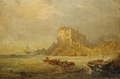 Bateau sur une mer agitée devant un rivage dominé par un château fantastique