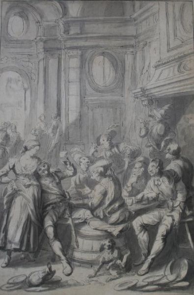 | ROWDY DRINKERS WITH A MAID IN AN INTERIOR; OFFICERS PLANNING MILITARY MANOEUVRES | |