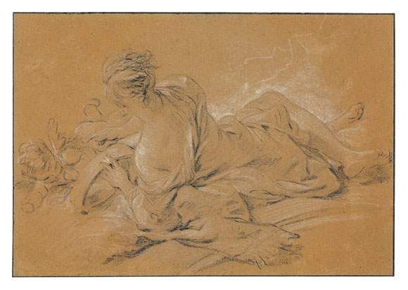 Jeune femme allongée tenant un tambourin, un putto à gauche