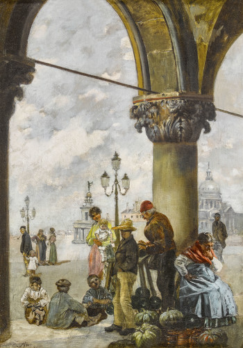 Gemüseverkäufer unter den Arkaden der Piazzetta in Venedig