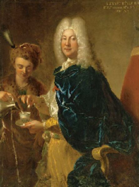 | Portrait of Le Blanc, Minister of War, three-quarter-length, being served chocolate by a young male servant | |