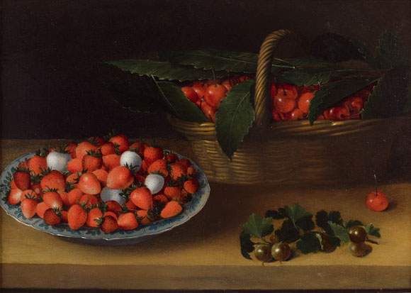 | Nature morte au panier de cerises et à la coupe de fraise sur un entablement | |