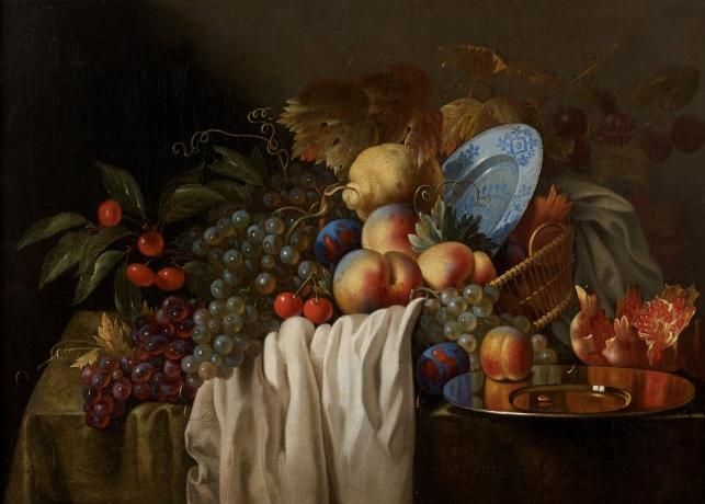 Composition aux fruits, au plat en étain et au plat de porcelaine