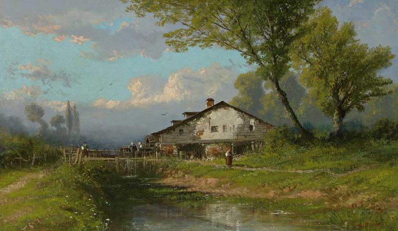 Bachlandschaft mit malerischer Mühle und Figurenstaffage an einem prachtvollen Frühlingstag.