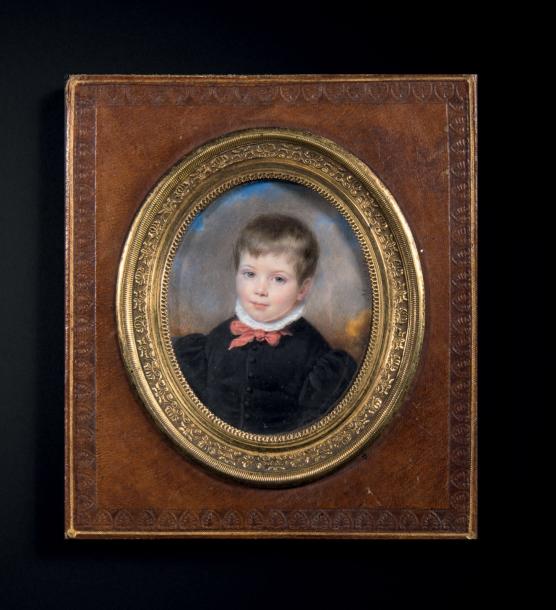 | Portrait d'un jeune garçon blond, en buste vers la gauche, presque de face en vêtement foncé noir, noeud rouge, col blanc et fon | |