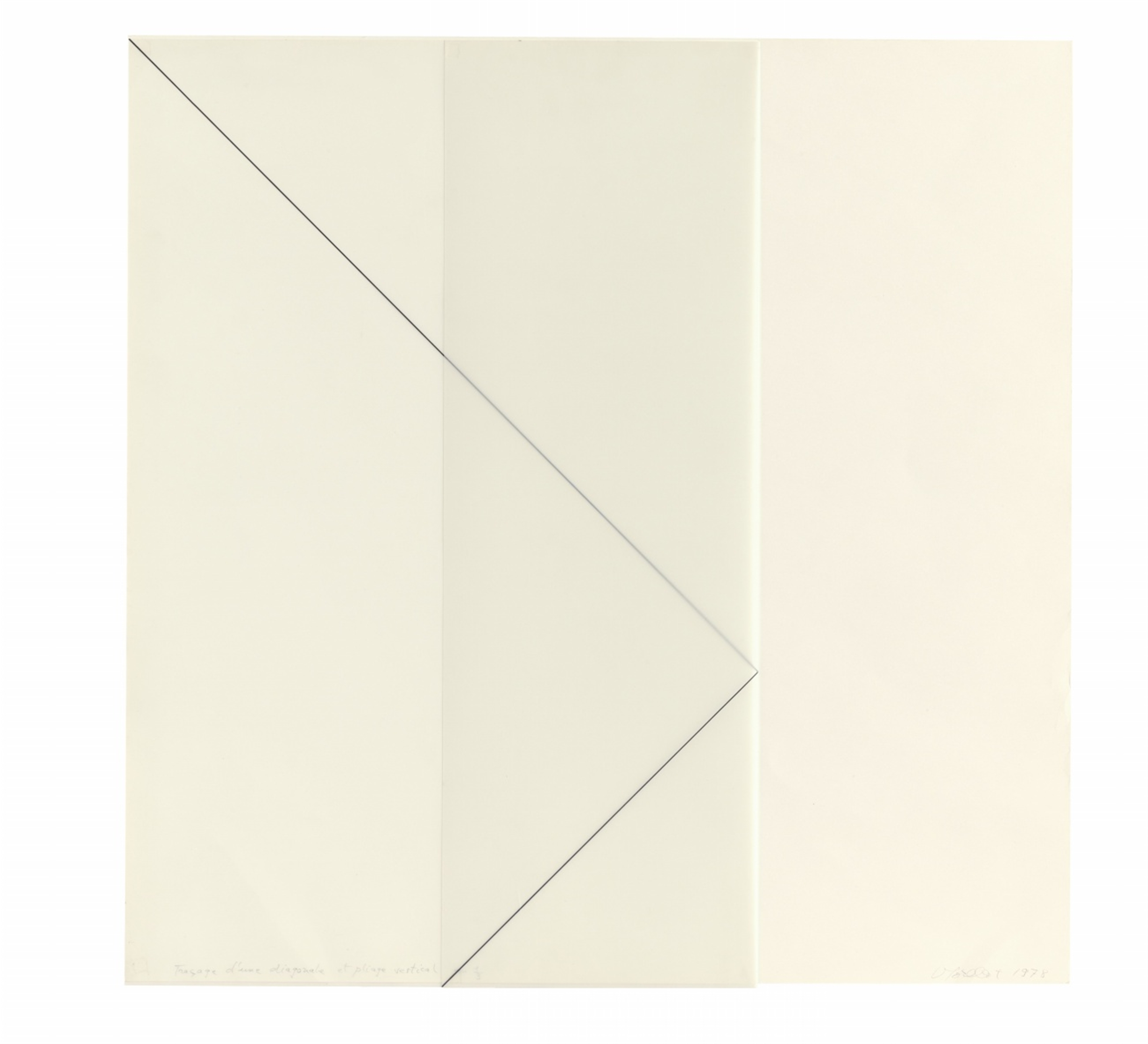 | Traçage d’une diagonale sur un carré de calque et pliage vertical au 1/3 | |