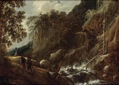 | A WOODED RIVER LANDSCAPE WITH FIGURES CONVERSING ON A PATH NEAR A WATERFALL | |