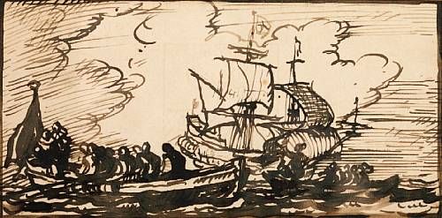 A ship and rowing boats at sea