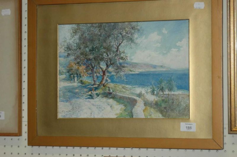 Coastal landscape with figures, possibly the Mediterranean