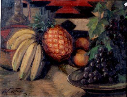 Stilleben mit vielen Früchten, u.a. Bananen und Ananas