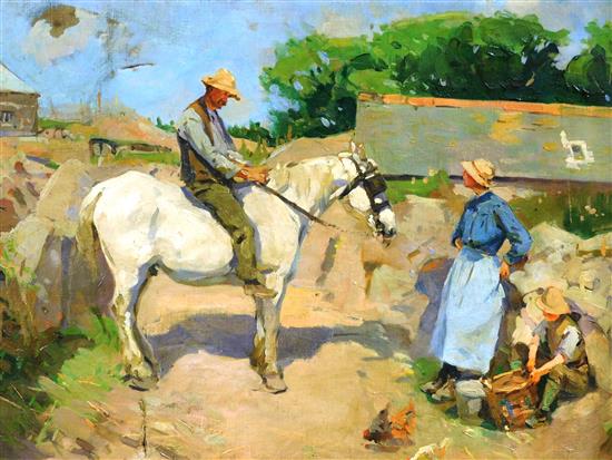 | untitled figural scene depicting man on horseback talking to woman and child on road with chickens | |