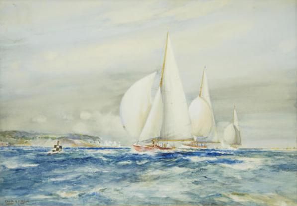 | 'Spinakers full and racing through the gap'; yachts running into the Solent past the Needles (off their starboard beam) and Hurs | |