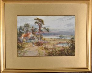 | A COUNTRY COTTAGE AT EVENING WITH A FIGURE ON THE PATH IN THE FOREGROUND AND SHEEP GRAZING IN THE MIDDLE DISTANCE | |