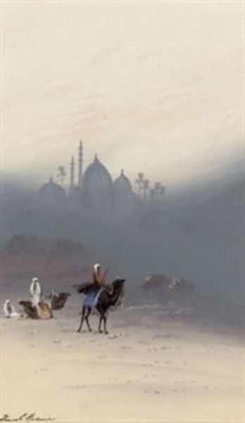 Camel train in the early morning mist