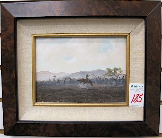 | Cowboy on bucking bronco with spectators around the rail, windmill in the distance | |