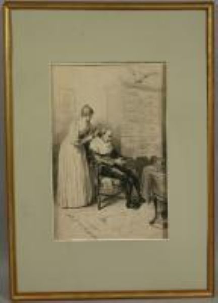 | woman grooming man in front of Queen Anne highboy, black and white | |
