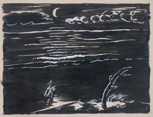Pendant la nuit, Pinsel in Schwarz, weiß gehöht