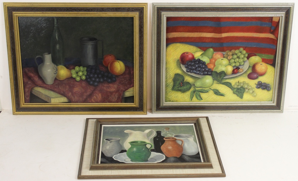2x Stilleven met fruit; Stilleven met flessen en kannen,