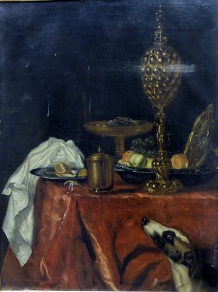 Dining table with fruit and bowls, plates, goblet, etc, a greyhound looking on