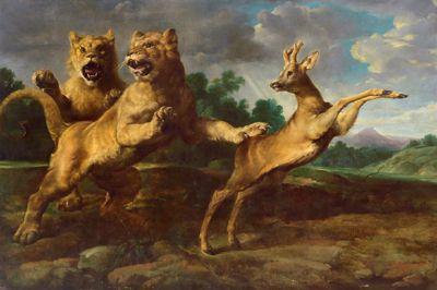 | Two lionesses chasing a roebuck, illegibly inscribed at lower left | |