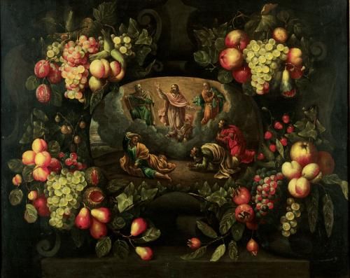 | STILL LIFE OF A GARLAND OF FLOWERS ADORNING A STONE CARTOUCHE CONTAINING THE TRANSFIGURATION | |