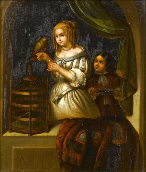 A YOUNG WOMAN AND HER PAGE WITH A BIRD AT A WINDOW