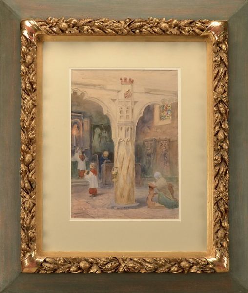 Kyrkointerriör med kvinna i bön och präst samt korgossar
