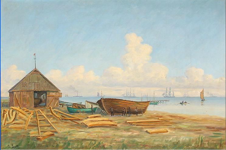 | Coastal scene with boats on the beach and numerous sailing ships at sea. | |